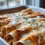 These 38g Protein Chicken Enchiladas feature shredded chicken seasoned with cumin and garlic powder, wrapped in whole wheat tortillas, and topped with a creamy Greek yogurt-based white sauce and melted cheese. Baked to perfection, this dish offers a healthy and protein-packed twist on classic enchiladas with a rich, dreamy sauce.