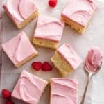 - Final Mix and Frost: Scrape down the sides once more and whip the buttercream for an additional 2 minutes. Spread the raspberry buttercream evenly over the cooled almond cake.