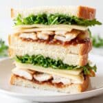 These Apricot Brie Chicken Sandwiches combine tender shredded chicken, creamy melted brie, sweet apricot preserves, and a peppery handful of arugula on toasted bread. Broiled to melt the cheese perfectly, this sandwich is a delightful blend of sweet, savory, and fresh flavors, making it a quick and delicious lunch or light dinner option.