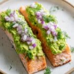 - Serve: After baking, remove the salmon from the oven. Spoon the prepared avocado mash evenly over each salmon fillet. Finally, sprinkle the chopped red onion on top for a fresh and crunchy finish.