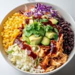 A healthy and flavorful BBQ Chicken Cottage Cheese Bowl that combines shredded BBQ chicken with creamy cottage cheese, roasted corn, black beans, fresh avocado, and crunchy coleslaw, topped with cilantro for a refreshing finish. This quick and easy bowl is perfect for a nutritious lunch or dinner.