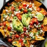 A black skillet filled with multiple layers of crispy orange tortilla chips topped with melted cheese, small red cherry tomatoes, bright green sliced avocado pieces, and dark green fresh herb leaves scattered on top. There are dollops of white sour cream and small bits of crumbled white cheese spread evenly over the dish. Lime wedges are placed around the center, adding a fresh touch. The skillet is set on a white marbled surface. Photo taken with an iphone --ar 4:5 --v 7