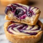 The image shows a close-up of two mini tarts placed on a white marbled surface. Each tart has two visible layers: the bottom layer is a thick, golden-brown crust with a crumbly texture, and the top layer consists of a deep purple blueberry filling swirled with a creamy, pale dough pattern that adds texture and color contrast on the surface. One tart is whole, while the other is cut in half and balanced on top of the whole tart, revealing the soft, light yellow interior of the dough along with juicy blueberries inside. Photo taken with an iphone --ar 4:5 --v 7