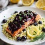 - Assemble and Serve: Spoon the lemon herb couscous onto serving plates or a platter. Top each portion with a blueberry glazed salmon fillet and drizzle additional blueberry glaze on top for extra flavor. Garnish with fresh parsley, lemon wedges, or microgreens to add a visual pop before serving.