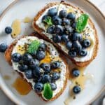 A simple and delicious Blueberry Ricotta Toast recipe featuring creamy ricotta cheese, fresh blueberries, and a touch of honey on toasted whole grain bread, garnished with fresh mint leaves for a refreshing finish. Perfect for a quick breakfast or a light snack.