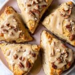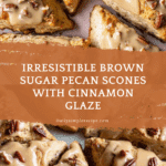 These Brown Sugar Pecan Scones are buttery, flaky, and studded with crunchy pecans, lightly sweetened with brown sugar. Topped with a luscious cinnamon brown sugar glaze and extra pecans, they make a perfect indulgent breakfast or afternoon treat.
