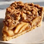 A close-up image of a slice of apple crumble pie on a white plate. The slice shows three visible layers: a golden-brown crumbly topping with a rough and crisp texture, a middle layer of tender, cooked apple slices in a light brown syrup, and a thick, light golden crust at the bottom. The background is a white marbled surface with soft natural light casting gentle shadows. Photo taken with an iphone --ar 4:5 --v 7