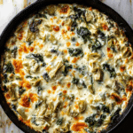 This Cheesy Baked Spinach Artichoke Dip is a crowd-pleasing appetizer that’s creamy, flavorful, and perfect for any gathering. With a blend of melted cheeses, fresh spinach, and tangy artichokes, it’s irresistible served warm with toasted bread or crackers.