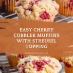 Keywords: cherry cobbler muffins, cherry muffins, streusel topping, baked muffins, breakfast muffins, dessert muffins