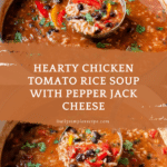 Keywords: Chicken soup, tomato rice soup, pepper jack cheese soup, chicken thighs soup, spicy chicken soup, hearty soup recipe, black beans soup, one pot soup