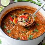 Keywords: Chicken soup, tomato rice soup, pepper jack cheese soup, chicken thighs soup, spicy chicken soup, hearty soup recipe, black beans soup, one pot soup