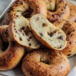 These homemade Chocolate Chip Bagels feature a chewy texture with bubbly caramelized crusts and pockets of melted semisweet chocolate morsels. Made from scratch with a slow overnight proofing process and boiled before baking on pizza stones, these bagels offer a bakery-quality taste and chew in your own kitchen. Ideal for breakfast, brunch, or a sweet snack, this recipe delivers tender dough and just the right amount of sweetness with every bite.