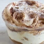 A clear glass bowl filled with a creamy spread that has swirls of dark cocoa powder mixed throughout the top layer, creating a marbled effect. The creamy base is light beige with a smooth and thick texture, while the cocoa swirls add contrast with their rich brown color and powdery finish. There is a light dusting of white powdered sugar on parts of the top, adding a delicate texture and brightness. The bowl sits on a white marbled surface, and in the blurred background, there is a hint of light brown items. photo taken with an iphone --ar 4:5 --v 7
