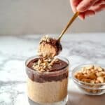 A clear glass cup holds two visible layers: a thick, creamy beige base with specks, topped with a dark brown, rich chocolate layer sprinkled with small light-colored nut pieces. A woman's hand holds a shiny gold spoon lifted above the cup, showing a scoop with both layers and nuts on top. Next to the cup on the right is a small clear bowl filled with beige nuts. The whole scene rests on a surface with a white marbled texture. Photo taken with an iphone --ar 4:5 --v 7