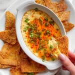 If you prefer, serve the dip with tortilla chips, crackers, veggie sticks, pita wedges, or any sturdy chip that can hold up to dipping.