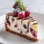 This decadent Cranberry White Chocolate Cheesecake features a buttery chocolate cookie crust filled with a creamy blend of cream cheese, sour cream, and white chocolate, studded with fresh cranberries. Baked in a water bath for a perfectly smooth texture, it is topped with a luscious white chocolate drizzle and optional sugared cranberries for an elegant finish, making it an ideal dessert for festive occasions or special gatherings.