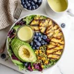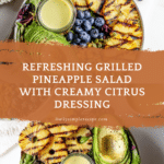 A vibrant and refreshing grilled pineapple salad paired with a creamy citrus dressing made from fresh orange and lemon juices, olive oil, and herbs. This salad combines the smoky sweetness of grilled pineapple and charred corn with fresh avocado, blueberries, pepitas, and mixed greens for a colorful, tasty, and nutritious meal.