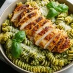 - Assemble and Serve: Plate the pesto-coated pasta and top with the sliced crispy chicken strips. Garnish with fresh basil leaves, a squeeze of lemon juice if desired, and extra Parmesan cheese to enhance the flavors and presentation.