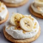 Store the cookies in an airtight container in the refrigerator for up to 4 days to keep the banana cream topping fresh. Let them come to room temperature before serving or enjoy them chilled. Avoid freezing the cookies with the topping, as the texture may change upon thawing.