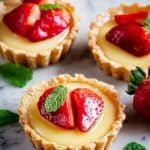 These Delightful Strawberry Honey Custard Tarts with Lemon Curd combine a crisp shortcrust pastry base with a creamy, smooth custard filling, fresh sliced strawberries, and a tangy lemon curd drizzle. Perfectly baked and chilled, they offer a refreshing and elegant dessert that’s perfect for any occasion.