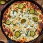 A skillet holds a baked dish lined with brown parchment paper, with a golden-brown melted cheese layer on top, showing some bubbly, slightly crispy spots. Underneath the cheese are creamy white layers mixed with finely chopped herbs, and round green pickle slices scattered evenly across the surface with fresh dill sprigs sprinkled for garnish. The skillet rests on a wooden base, and a couple of pickle slices are placed beside it. photo taken with an iphone --ar 4:5 --v 7