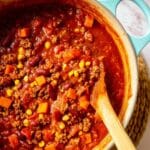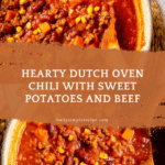 Keywords: Dutch oven chili, chili recipe, ground beef chili, easy chili, comfort food, sweet potato chili, hearty chili