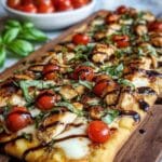 This Easy Chicken Caprese Flatbread recipe combines fresh, vibrant Italian flavors with a crispy flatbread base, making it a perfect quick meal or appetizer. Featuring tender shredded chicken, basil pesto, fresh mozzarella, and juicy tomatoes, all baked to golden perfection and finished with fragrant basil and optional balsamic glaze for a delectable sweet-tangy finish.