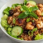 - Step 5: In a large bowl, combine the cooked chicken, shredded lettuce, cucumbers, mint leaves, spring onions, and edamame. Drizzle with cilantro lime dressing and toss gently to coat. Top with crispy baked rice and chopped cashews. Serve immediately for best texture and freshness.