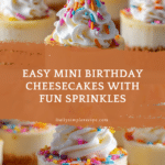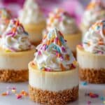 Keywords: mini cheesecakes, birthday dessert, cheesecake recipe, individual cheesecakes, party dessert, no-bake crust, sprinkles cheesecake