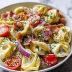 Keywords: tortellini salad, bacon tortellini salad, pasta salad, cheese tortellini recipe, Italian pasta salad, make-ahead salad