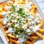 Store any leftover feta yogurt sauce separately in an airtight container in the refrigerator for up to 3 days. Leftover fries are best eaten fresh but can be reheated in a hot oven or air fryer to regain some crispiness. Avoid storing fries with the sauce on to prevent sogginess.