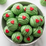 These Grinch Oreo Balls made with Red Velvet Oreos are a festive and delightful treat perfect for holiday celebrations. Creamy cream cheese is mixed with crushed red velvet Oreos, then coated in vibrant green candy melts and topped with red heart sprinkles for a fun Grinch-themed dessert that’s easy to make and absolutely delicious.