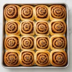 The image shows a metal baking tray filled with 15 golden-brown cinnamon rolls arranged in a 3 by 5 grid. Each roll has a visible spiral shape with layers of soft dough and a cinnamon filling, topped with small bits of crushed nuts adding a crunchy texture. The rolls have a shiny surface from a light glaze, with some darker brown edges where the dough baked more. The tray sits on a white marbled surface. Photo taken with an iphone --ar 4:5 --v 7