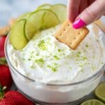 5. Garnish and Serve: Before serving, sprinkle the dip with additional lime zest for a fresh aroma and burst of color. Serve the dip chilled alongside strawberries, pineapple chunks, graham crackers, Nilla wafers, or animal crackers for dipping.