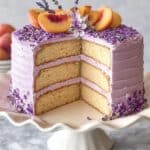 Keywords: lavender cake, peach cake, floral dessert, summer cake, buttercream frosting, peach preserves, baked cake, lavender frosting