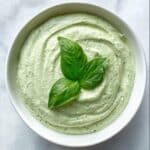 A white bowl holds a single thick layer of pale green creamy dip with a smooth, slightly textured surface showing small green specks inside. On the center top of the dip, there is a small sprig of three fresh, vibrant green basil leaves. The bowl sits on a white marbled textured surface, creating a clean and fresh look. photo taken with an iphone --ar 4:5 --v 7