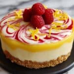 A luscious Lemon Raspberry Swirl Cheesecake featuring a buttery graham cracker crust, creamy lemon-infused cream cheese filling, and a vibrant raspberry swirl topping, baked to perfection. This dessert balances tart citrus with sweet raspberries, perfect for special occasions or an indulgent treat.