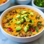 This Lightened Up Taco Soup is a flavorful and comforting dish that’s perfect for any day of the week. It combines hearty ground beef with a blend of spices and a creamy finish, creating a rich yet lighter twist on classic taco soup.