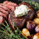 A close-up of a cooked steak with a brown, grilled outer layer and a pink, sliced interior to the left, topped with a dollop of white herb butter with green specks in the center. Surrounding the steak are fresh green sprigs of thyme and small, browned roasted shallots with a golden and purple color on the right side. The image background shows a dark pan with a shiny, slightly oily surface. Photo taken with an iphone --ar 4:5 --v 7