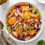 A refreshing and vibrant Mandarin Orange Chicken Salad combining shredded napa and red cabbage, crunchy vegetables, tender chicken, and a zesty homemade orange sesame dressing. This salad is topped with mandarin slices, roasted almonds, and optional sesame seeds for a perfect balance of flavors and textures, ideal for a light lunch or dinner.