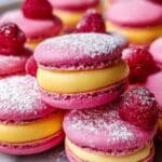 Mango Raspberry Macarons are delicate French macarons featuring crisp almond meringue shells tinted with yellow food coloring and filled with luscious mango buttercream and fresh raspberry pureed filling. This elegant dessert combines tropical mango sweetness and vibrant raspberry tartness for a fresh, flavorful treat perfect for special occasions or an impressive homemade delight.
