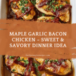 Keywords: Maple Garlic Bacon Chicken, baked chicken thighs, sweet and savory chicken, bacon chicken recipe, maple syrup chicken, easy dinner