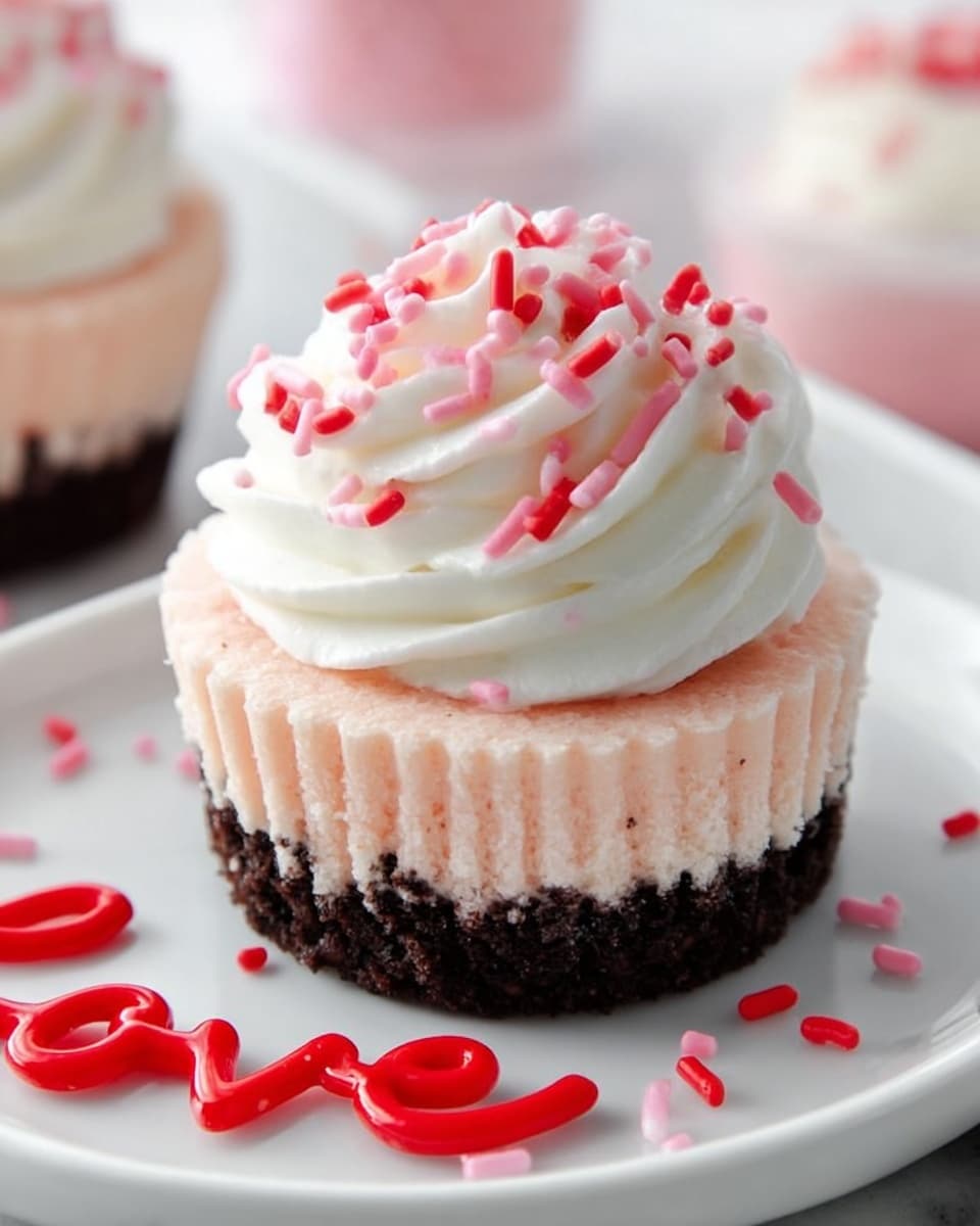 These Mini Valentine Cheesecakes are a delightful and festive treat perfect for celebrating love. Featuring a creamy, smooth cheesecake filling tinted with neon red food coloring atop a buttery Oreo crumb crust, these bite-sized desserts are easy to make and wonderfully charming. Finished with optional whipped cream and Valentine sprinkles, they’re ideal for parties, gifts, or a special dessert.