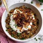 Keywords: Mujadara, lentils and rice, Middle Eastern recipe, caramelized onions, vegan main dish, healthy lentil recipe