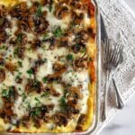 This hearty Mushroom Polenta Casserole combines creamy polenta with sautéed mushrooms and sage, topped with a melty cheese layer and served alongside a flavorful garlic yogurt sauce. Perfectly baked until golden, this comforting dish offers a delightful blend of textures and Mediterranean flavors.