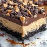 These No Bake Peanut Butter Cheesecake Bars combine a crunchy Oreo cookie crust with a rich hot fudge layer and a creamy peanut butter cheesecake filling, topped with chocolate and peanut butter chips. Perfectly sweet and easy to prepare without an oven, these bars are a decadent treat that can be made ahead and chilled for a delightful dessert or snack.