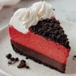A slice of cake is shown on a white plate with a speckled pattern, placed on a white marbled surface. The cake has three visible layers: the bottom layer is a thin dark chocolate crust, the middle layer is a thick, smooth, and rich red mousse, and the top layer is covered with a crumbly dark chocolate cookie topping. On one side of the cake slice, there is a thick swirl of white whipped cream, adding a soft texture contrast. Some dark cookie crumbs are scattered around the plate. Photo taken with an iphone --ar 4:5 --v 7