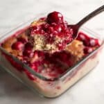 A close-up image of a square glass container filled with a two-layer dessert. The bottom layer is light beige and grainy in texture, while the top layer is a vibrant mix of chunky, bright red berries baked into a golden brown crust. A spoon is lifting a scoop of the dessert showcasing both layers, with the berry topping visibly thicker and textured with whole berries and baked edges. The container is placed on a white marbled surface. photo taken with an iphone --ar 4:5 --v 7