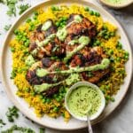 Keywords: Peruvian chicken, grilled chicken, yellow rice, Peruvian yellow rice, green sauce, cilantro sauce, jalapeño sauce, turmeric rice, flavorful chicken recipe