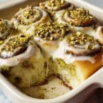 - Ice & Serve: Spread the pistachio cream cheese icing evenly over the warm rolls. Garnish with extra chopped pistachios if desired. Serve immediately while warm and enjoy the melty, nutty sweetness.